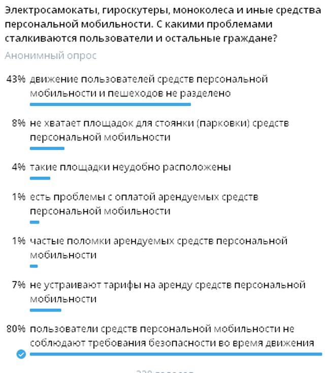 Да, это не социологическое исследование, но с распределением голосов не поспоришь: пользователь СПМ воспринимается как не очень-то дисциплинированный участник движения. Этот тезис подтверждают последние самокатные ДТП.