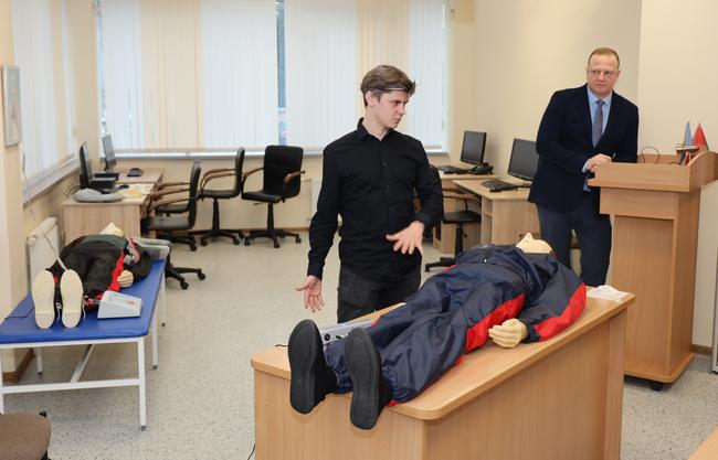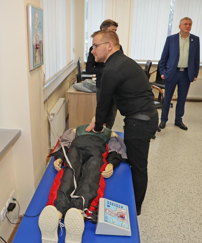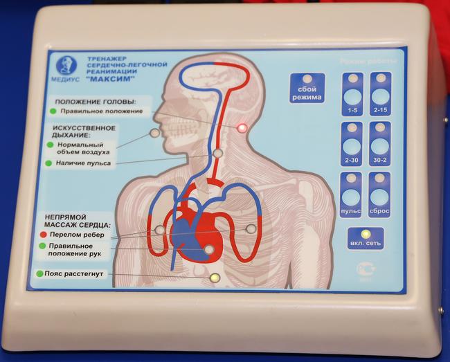 Особый акцент был сделан на отработке сердечно-легочной реанимации с использованием современного тренажера «Максим» в виде манекена. К нему подключены стенд с изображением внутренних органов и кровеносных сосудов человека и лампочки, благодаря которым обучаемый может видеть, правильно ли он делает сердечно-легочную реанимацию, и соответственно корректировать свои действия. Если зажигается красный сигнал – значит, вы что-то делаете не так, зеленый – все верно. Например, один из датчиков показывает правильное расположение рук на грудной клетке и точную глубину нажатия на нее.