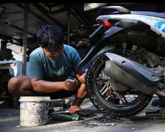 Латая колеса мопеда, Йога Фаджри Пратама гадает, кто так изощренно портит жизнь байкерам