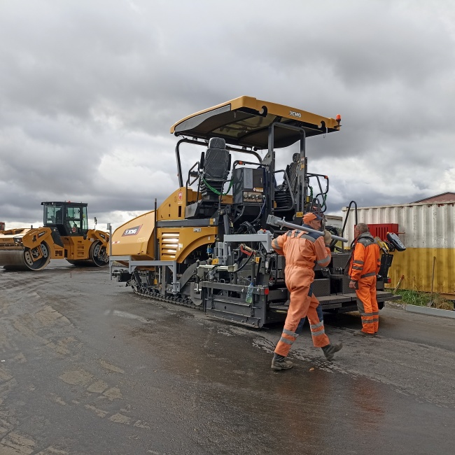 На объекте проходит обкатку новый асфальтоукладчик китайского производства XCMG 2025 года выпуска с шириной укладки 5 метров. Его 18-летний «собрат», похоже, отправится «на пенсию», прогнозирует Владимир Пасевич. Китаец меньше ремонтируется, не дает простоев, работает быстрее.