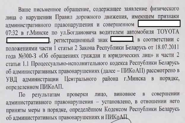В редакцию «ТБ» обратился автовладелец, представившийся Дмитрием, ставший жертвой «учителя». Фрагмент его письма: «Утром около 7 часов ехал на работу по улице Богдановича в Минске. В своей полосе, никого не трогал, но вдруг водитель, едущей по соседней полосе машины резко перестроился передо мной в мой ряд. Пришлось экстренно тормозить, причем маневр водитель совершил без включения сигналов поворота.